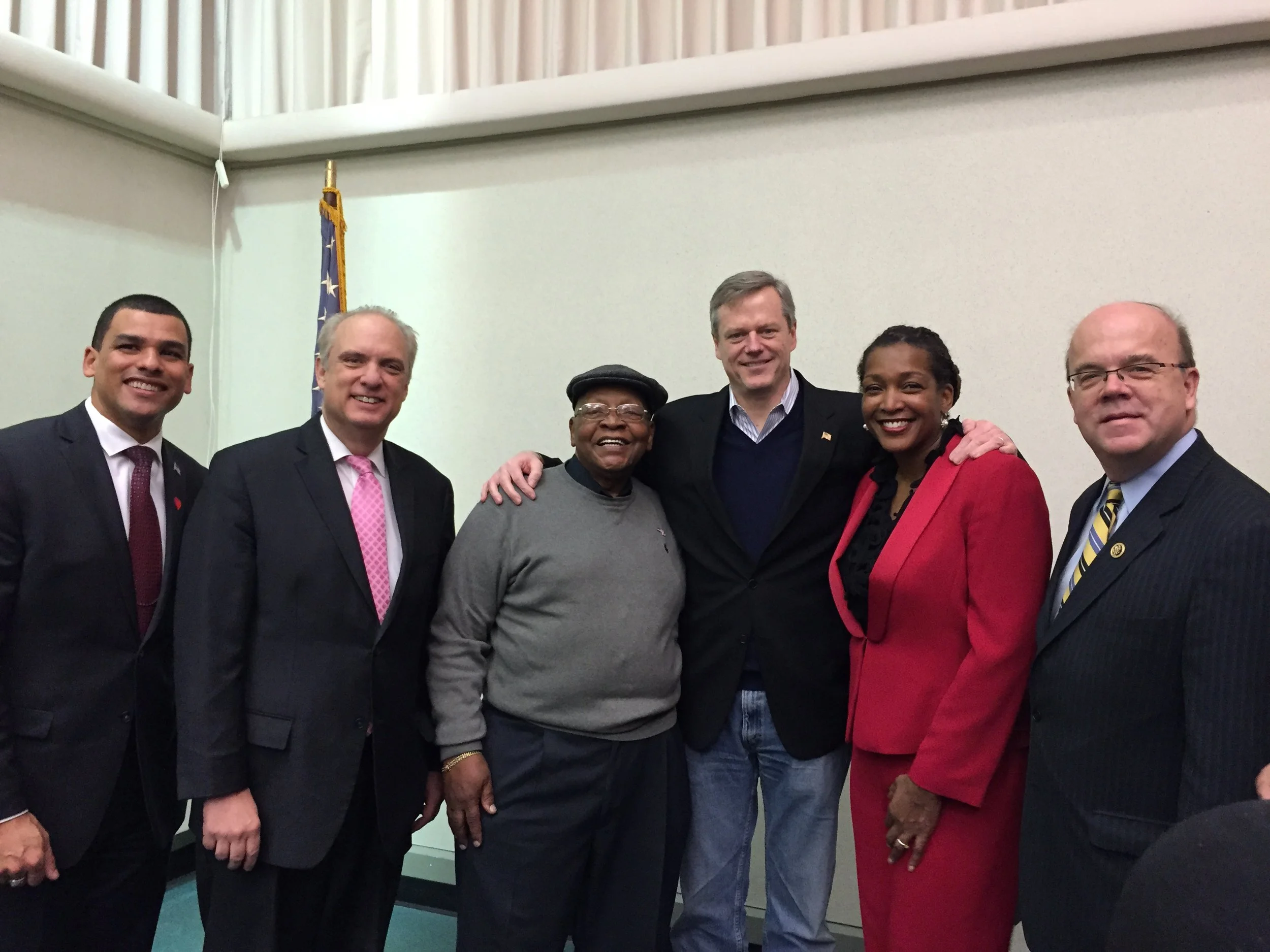 Former Massachusetts Governor Michael Dukakis and former Boston City Councilor Tito Jackson with Haywood Fennell, Sr,, Founder of Tri-Ad Veterans League.